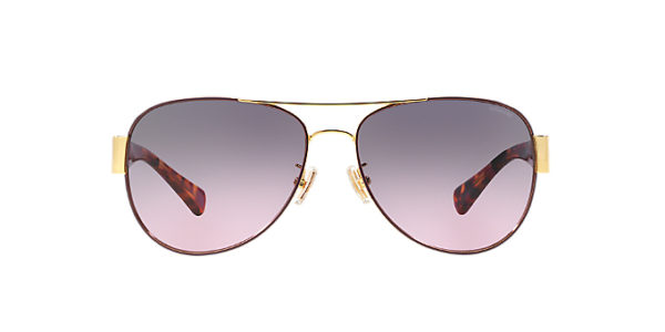 CoachĀ® is a modern luxury brand with a rich American heritage. The Horse & Carriage is the brand’s signature motif, and lends a timeless stamp to its designer eyewear. The metal pilot goes glam in these dramatic gold sunglasses with gold gradient mirror lenses. Crafted from metal, these frames are flexible as well as hypoallergenic. Ivory temples feature the iconic carriage logo and a metal hinge plaque. The signature Wild Beast leopard print on the interior adds a colorful touch.